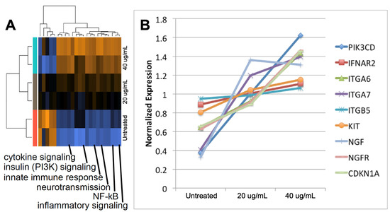 We investigated changes in gene expression in cells incubated in culture with exosomes isolated from epileptogenic tissue. We used SH-SY5Y cells, which have been widely used as a neuronal model [19] and are known to express TLR7/8 [20,21]. The cells were treated with 2 doses of exosomes from epileptogenic tuber tissue (20 and 40 ug/mL) and compared to untreated control cells. We performed gene expression analysis using the NanoString nCounter Neuroinflammation Panel [22]. This panel includes probes for 770 genes involved in key pathways representing inflammation, immunity, neurobiology, metabolism, and stress. The nCounter technology enables direct measurement of transcript abundance and provides quantitative sensitivity comparable to qRT-PCR, while avoiding bias inherent to reverse transcription and amplification reactions. Pathway analysis using NanoString nSolver software revealed a dose-response pattern of pathway alterations (Figure 3A). A cluster of pathways exhibited a dose-dependent increase, including inflammation, innate immune response (TLR), cytokine signaling, NF-κB, insulin (PI3K) signaling, and apoptosis. Induction of these pathways are characteristic of TLR7/8 activation.