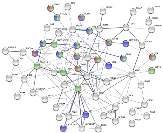 Highly interconnected hubs in protein-protein interaction (PPI) networks are characteristic of functionally significant proteins. We identified the PPI network among the set of 84 induced genes using the STRING server [25]. The PPI network of this gene set is significantly enriched for interactions compared to what is expected by chance (p < 1.0 × 10−16). Interconnected genes (64) are shown in Figure 4, with genes involved in innate immune response (p = 4.81 × 10−5), inflammatory response (p = 0.0035), and cytokine mediated signaling (p = 9.02 × 10−10) colored as blue, red, and green, respectively. Fourteen of the induced genes are involved in innate immune response (blue), and several of these are critical signaling mediators immediately downstream of TLR7/8 (IRF7, IRAK4, NFKB2) [26,27]. Highly connected key nodes in the network were identified by tabulating the number of interactions for each node. The top nodes with the greatest number of interactions include CDKN1A (p21), and SQSTM1 (p62). SQSTM1 (sequestosome-1, p62) is involved in immune system signaling, NF-κB activation, autophagy, and nutrient-dependent activation of mTOR [28]. A dose response is evident in the gene expression patterns of SQSTM1 and CDKN1A in cells treated with exosomes from epileptogenic tissue (Figure 5).