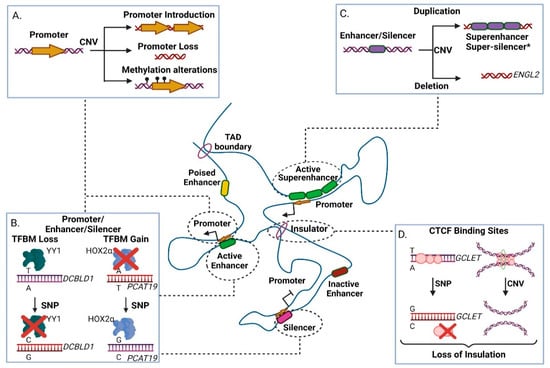 There are numerous examples of genomic variants in cis-regulatory regions that affect transcription of coding or non-coding target genes [118,119,120]. Promoters (especially the core promoter) are the prime regulatory units of transcription, as they embed transcription factor motifs that enable formation of the Pre-Initiation Complex (PIC) adjacent to the transcription start site of the gene [121]. In many cancer types of promoter activity is altered by inherited or somatic mutations, leading to the modulation of cryptic promoter activity, loss of promoter DNA methylation or alteration (including loss or gain) of key regulatory motifs (Figure 2A, [122]).