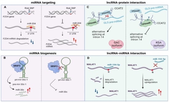 Examples of genomic variants affecting non-coding RNAs function. (A) 3′UTR-occurring SNPs disturb miRNA targeting via sequence-based mismatches. (B) SNPs in pri-miRNA transcript can alter miRNA biogenesis. (C) SNPs can affect lncRNA–protein interactions via alterations in lncRNA secondary structure (D) SNPs can alter lncRNA stability via modulation of miRNA binding sites. UTR—Untranslated region, pri-miRNA—primary miRNA, pre-miRNA—precursor-miRNA, lncRNA—long non-coding RNA, miRNA—microRNA, GLS—glutaminase, GAC—glutaminase isoform C, KGA— kidney glutaminase isoform. Created with BioRender.com, permission: 15 July 2021.
