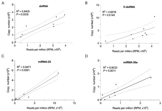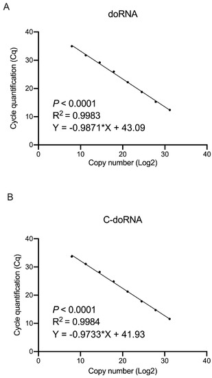 2.5. doRNA and C-doRNA Detection by Splinted 5′ Adapter RT-qPCR Is Linear over a Range of 7 Logs