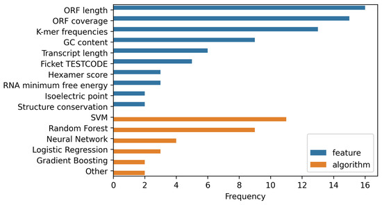 A comparison of the frequencies of commonly used features (blue) and algorithms (orange) applied by different contemporary tools. A majority of the latter rely on open reading frame (ORF) information to make predictions. Other often utilized features include subsequence (k-mer) frequencies and GC content. SVMs and Random Forests dominate the field as the most commonly implemented algorithms. This is not surprising, as they are two of the by far most flexible approaches for nonlinear classification.