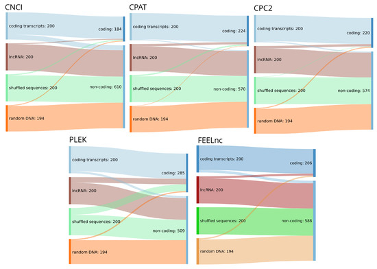 Sankey diagrams for the input dataset consisting of 200 randomly chosen lncRNA, 200 coding transcripts, dinucleotide shuffled versions of the latter and 194 randomly chosen sequences from the human genome (hg38) and corresponding annotation (RefSeq database [40] v38) and their assignment to coding or non-coding classes by five high-impact classification tools. All tools were run with standard settings where applicable.