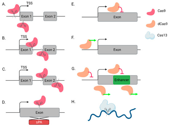 The DSBs that are generated by Cas9 can be used for introducing foreign DNA into the break site—knock-in; most often by homology directed repair (HDR). This approach has been used to knock in a synthetic polyadenylation signal (spA) proximal to the transcription start site (TSS). It was shown that inserting three constitutive spAs leads to the termination of transcription immediately after the insert [44]. While this approach allows for the control of transcript length and can provide knowledge regarding the different roles of transcription initiation and the transcript itself, generating this model is time-consuming and requires multiple steps.