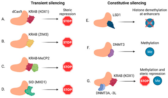Different approaches for efficient transient (A–D) or constitutive (E–G) gene silencing using CRISPRi. (A) dCas9 fused to the KRAB domain of KOX1. (B) dCas9 fused to the KRAB domain of ZIM3. (C) dCas9 fused to KOX1 KRAB and MeCP2. (D) dCas9 fused to the SID domain of MXD1. (E) dCas9 fused to DNMT3 leading to DNA methylation at the target site. (F) dCas9 fused to LSD1 leading to histone demethylation at enhancer regions. (G) CRISPR-off, comprising dCas9 fused to KOX1 KRAB and DNMT3A and -3L. (Created with BioRender.com (accessed on 12 December 2021)).