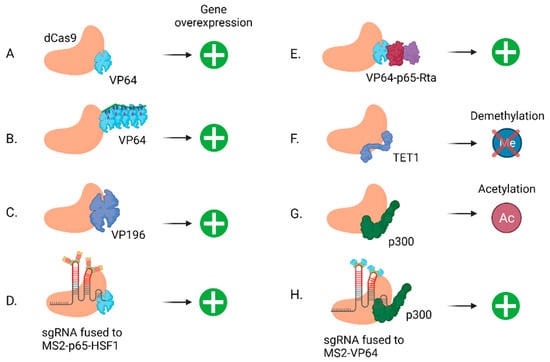 Different approaches for efficient gene activation using CRISPRa. (A) dCas9 fused to the VP64 viral repeat domain. (B) CRISPR SunTag, comprising multiple copies of VP64 fused to a protein scaffold and recruited to dCas9. (C) dCas9 fused to the VP196 viral repeat domain containing more repeats than VP64. (D) Synergistic activation mediator (SAM), comprising dCas9 fused to VP64 and a modified sgRNA fused to MS2, p65, and HSF1. (E) VPR, comprising dCas9 fused to VP64, p65, and Rta. (F) CRISPR-on, comprising dCas9 fused to TET1 to reverse the repressive methylation effect caused by CRISPR-off (See Section 2.2 and Figure 3G above). (G) dCas9 fused to p300 leading to H3K27 acetylation for gene transactivation. (H) enCRISPRa, comprising dCas9 fused to p300 and a modified sgRNA fused to MS2 and VP64. (Created with BioRender.com (accessed on 12 December 2021)).