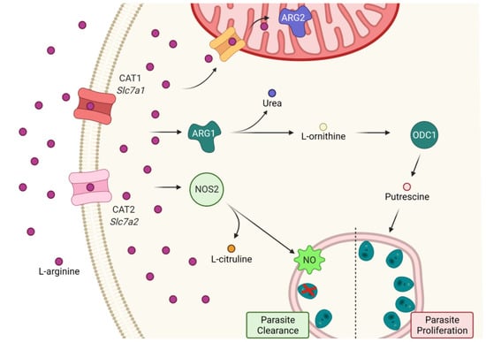 The availability of arginine, a common substrate to ARG1 and NOS2, can regulate the levels of CAT1 and CAT2 transporters in the external plasmatic membrane and the parasitophorous vacuole [,,]. This complex regulation in arginine uptake is one of the multiple factors involved in regulating production during Leishmania infection through Nos2 transcription and NOS2 translation and through the presence of the substrates and co-factors such as O2, biopterin, NADPH, and others []. As previously shown, the B6-macrophages only increased Nos2, NOS2, and NO production when miRNA let-7e was inhibited during L. amazonensis infection, reducing the infectivity []. The IL-1β and TNF levels also induced NO production []. Our group showed increased levels of arginine, citrulline, and polyamines inside the macrophages infected with L. amazonensis []. These data increased the modulation expectation of genes that can compete for arginine to produce polyamines, such as Cats, Arg1, Arg2, and Odc1. Although the levels of Cat1/Slc7a12 Cat2/Slc7a22 Arg1, and Odc1 did not behave as expected during infection, increased levels of the Arg2 transcript level were not reflected by the increased competition of cytoplasmatic arginine with NOS2 because of its mitochondrial localization. Further, the regulation of arginase 2 by miR-155 regulates the arginine availability in the DCs, allowing t-cell activation []. Il-10 and Arg2 synergy works to reprogram the immunometabolic response of macrophages in response to LPS, reducing the levels of succinate, HIF-1α, and IL-1β [].