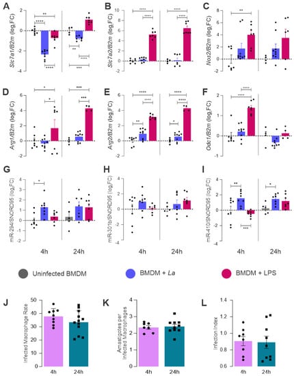 Quantification of L-arginine metabolism-related gene transcripts and miRNA levels on macrophages infected with L. amazonensis. Bone Marrow Derived-Macrophages were infected with stationary phase L. amazonensis promastigotes (MOI 1:5) or treated with LPS for 4 and 24 h. The total RNA was extracted and converted into cDNA to quantify transcripts of genes related to L-arginine metabolism through RT-qPCR: (A) Slc7a12 (B) Slc7a22 (C) Nos2, (D) Arg12 (E) Arg22 and (F) Odc1. The miRNAs levels were assessed through RT-qPCR: (G) miR-294, (H) miR-301b (I), and miR-410. The infected BMDM were fixed and Giemsa stained to assess the number of total macrophages (n = 600), infected macrophages and amastigotes. (J) infected macrophage rate [(infected macrophage/total macrophage) ∗ 100], (K) amastigotes per infected macrophage, and the product of infected macrophages rate with amastigotes per infected macrophage; (L) infection index (rate of infected macrophages multiplied by number of amastigotes per infected macrophage). Statistics: Each dot represents a biological replicate from three independent experiments. Mixed-effects analysis, post hoc test: Sidak’s multiple comparisons. p-values: *, p ≤ 0.05. **, p ≤ 0.001, ***, p ≤ 0.0005. ****, p ≤ 0.0001.