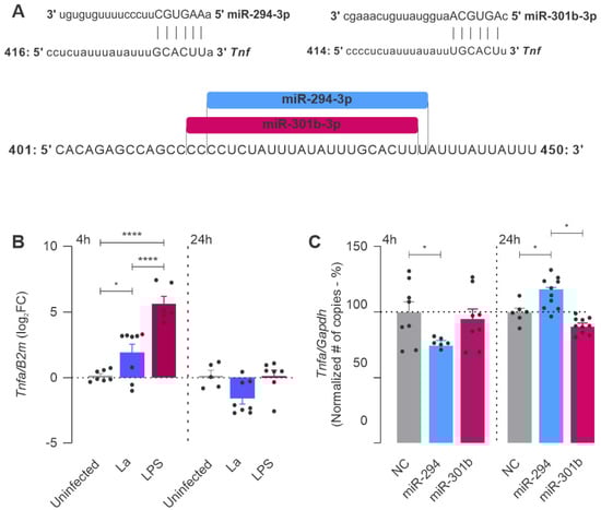 Tnfa is an miR-294 and miR-301b target. (A) In silico binding site prediction of miR-294 and miR-301b in the Tnfa 3′UTR. (B) Basal levels of Tnfa after L. amazonensis infection or LPS stimulation. (C) Quantification of the infection’s ability to produce Tnfa after miRNA inhibition. Statistics: Each dot represents a biological replicate from three independent experiments. Mixed-effects analysis, post hoc test: Sidak’s multiple comparisons. p-values: *, p ≤ 0.05; ****, p ≤ 0.0001.