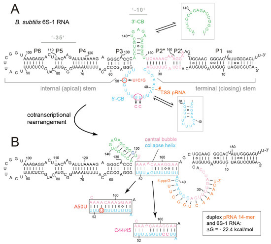 The open DNA promoter mimicry of 6S RNAs also enables RNAP to utilize the RNA as a template for the transcription of short abortive transcripts termed product RNAs (pRNAs; [17]). The abundance and the length pattern of pRNAs increases with intracellular NTP concentration, particularly of the initiating nucleotide (GTP) in the case of B. subtilis 6S-1 RNA-derived pRNA synthesis [12,17,18,19,20]. These pRNAs, when reaching a certain length (13 nt for E. coli 6S RNA, 14 nt for B. subtilis 6S-1 RNA; [16,18]) and depending on their GC content, have such low rate constants for dissociation from 6S RNA that they stably rearrange the 6S RNA structure. This triggers the release of 6S RNA:pRNA complexes from RNAP as an escape mechanism from the transcriptional block [12,17,21]. In the case of canonical 6S RNAs, this release mechanism is operational during outgrowth of cells from stationary phase upon nutrient resupply [5,12]. The pRNA-induced 6S RNA rearrangement involves the unwinding of 6S RNA helix P2 (termed downstream duplex or helix in the E. coli system [14,16]) and the formation of the 6S RNA:pRNA hybrid helix involving nucleotides of the 5′-central bubble (5′-CB) and the 5′-strand of the unwound P2/downstream helix (Figure 1 and Figure S1). For 6S RNAs from E. coli and other γ-proteobacteria, the unwinding of the downstream helix allows formation of a 9-bp long hairpin in the 3′-CB (Figure S1A) that was shown to make a major contribution to 6S RNA release induced by pRNAs as short as 13-mers [16]. In contrast, other 6S RNAs, such as A. aeolicus 6S RNA or B. subtilis 6S-1 RNA, do not form such an extended hairpin in the 3′-CB. In the case of B. subtilis 6S-1 RNA, a smaller 3′-CB hairpin already forms in free 6S-1 RNA, which appeared to be stabilized in the 6S-1 RNA:pRNA hybrid structure [12]. However, in B. subtilis 6S-1 RNA and A. aeolicus 6S RNA, another structural element was inferred to form upon pRNA transcription, termed the ‘central bubble collapse helix (CBCH)’, involving the 3′-strand of P2 and the distal sequence of the 5′-CB (Figure 1; [12,22]. These findings suggest differences in the pRNA-induced 6S RNA release mechanism of E. coli- and B. subtilis-type 6S RNAs.
