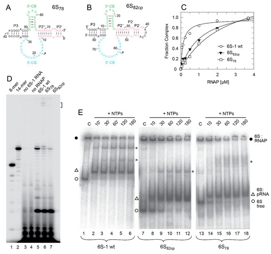 Figure 2. (A,B) Secondary structures of the truncated 6S-1 RNA derivatives (A) 6S78 (78 nt) and (B) 6S82cp (82 nt, circularly permuted) lacking larger parts of the terminal and internal stem, including the −35 region; color code as in Figure 1. (C) Binding of wt 6S-1 RNA, mutant RNA 6S82cp, and mutant RNA 6S78 to σA-RNAP, analyzed by gel shift assay (see Materials and Methods). A representative experiment is shown. The curves are fits to a one ligand binding site model; as Kd values for the two mutant RNAs were calculated with endpoints considerably above 1, they are not given here; K1/2 values (50% complex relative to the endpoint) were ~100 nM for wt 6S-1 RNA and ~1 µM for the two mutant RNAs. (D) pRNA transcription using wt 6S-1 RNA or one of the two truncation variants as template (lanes 5–7). Lanes 1 and 2, 5’-32P-end-labeled synthetic 6S-1 pRNA 8-mer (lane 1) and 14-mer (lane 2); lanes 3 and 4, controls lacking either 6S RNA (lane 3) or enzyme (lane 4); lanes 5–7: pRNA transcription for 1 h at 37 °C in the presence of 2 µM of the respective 6S RNA variant, 2.5 µM σA-RNAP, 200 µM each NTP, and 250,000 c.p.m of [α-32P]-UTP per lane. The bracket at the upper right marks bands attributable to hybrids of 6S78 RNA and pRNA runoff transcripts (17-mers). (E) Refolded 5’-32P-end-labeled wt 6S-1 RNA, 6S82cp or 6S78 RNA was preincubated with σA-RNAP for 30 min at 37 °C. Then, NTPs were added to the mixture to induce transcription of pRNAs and the samples were incubated at 37 °C for the time period indicated above each lane. The final concentrations were 1 µM for the 6S-1 RNA variants, ~2 µM for σA-RNAP, and 200 µM each NTP. Lanes C, no NTPs added and incubation at 37 °C for 180 min. Samples for all three 6S RNA variants were analyzed on the same 7.5% native PAA gel; for further details, see Materials and Methods. These experiments were conducted with the native σA-RNAP. Filled circles indicate 6S RNA:RNAP complexes, open triangles 6S RNA:pRNA complexes and open circles free 6S RNA, either wt 6S-1 RNA, 6S82cp or 6S78 RNA; asterisks indicate bands of unknown nature not observed in other experiments.