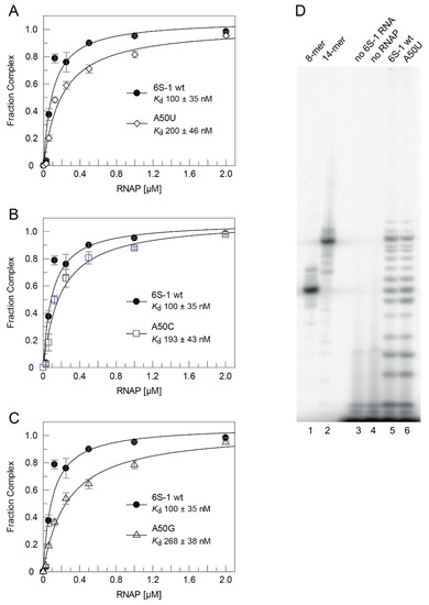 Figure 3. σA-RNAP affinity of 6S-1 RNA A50 mutants and pRNA transcription pattern of the A50U mutant RNA. (AC) σA-RNAP affinity of mutant RNAs (A) A50U, (B) A50C and (C) A50G relative to wt 6S-1 RNA, measured by gel shift assay using the native σA-RNAP. The calculated Kd values (fit to a one ligand binding site model) are indicated within each graph; data points in graphs A-C were based on three independent experiments each (error bars, SEM). (D) pRNA transcription using the wt (lane 5) and A50U mutant (lane 6) 6S-1 RNA as template, performed as in Figure 2D. Lanes 1 and 2, 5’-32P-end-labeled synthetic 6S-1 pRNA 8-mer (lane 1) and 14-mer (lane 2); lanes 3 and 4, controls lacking either 6S RNA (lane 3) or enzyme (lane 4). For details, see Materials and Methods. These experiments were conducted with the native σA-RNAP.