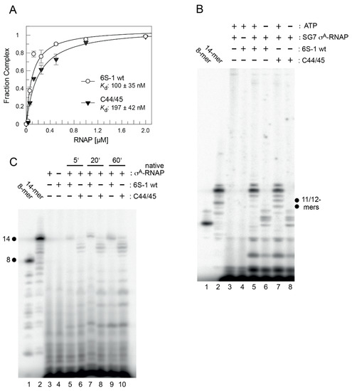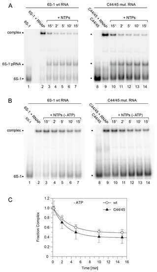 Figure 6. pRNA-induced rearrangement and release of wt and C44/45 mutant 6S-1 RNA upon addition of (A) all four NTPs or (B) CTP/GTP/UTP only. Each NTP had a final concentration of 100 µM. (A) Lanes 1 and 8, 5′-32P-labeled 6S-1 RNA only; lanes 2 and 9, 6S-1 RNA incubated with 2 µM SG7 σA-RNAP; lanes 3–7 and 10–14, as lanes 2 and 9, but followed by addition of NTPs and withdrawal of aliquots at the indicated time points. (B) As in panel A, but addition of CTP/GTP/UTP only (-ATP) in lanes 3–7 and 10–14. (C) Kinetics of wt and C44/45 6S-1 RNA release from σA-RNAP upon pRNA-induced 6S-1 RNA refolding in the presence of CTP/GTP/UTP only; based on two independent experiments including the one shown in panel B (error bars, SEM). The data was fit to an equation for a single exponential with offset, yielding rate constants k of 0.3 ± 0.03 min−1 (wt) and 0.35 ± 0.04 min−1 (C44/45) and offsets (= endpoints representing release-resistant complexes) of 0.48 ± 0.01 (wt) and 0.39 ± 0.02 min−1 (C44/45). For further details, see Section 2.7.