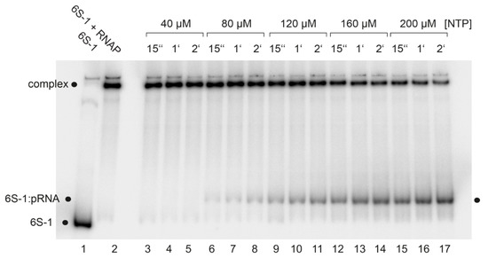 Figure 5. NTP concentration dependence of pRNA synthesis as well as 6S-1 RNA rearrangement and release, analyzed by gel shift assay (7.5% native PAGE). Lane 1, 6S-1 RNA (10 nM 6S-1 RNA); lane 2, as lane 1 plus 2 µM native σA-RNAP; lanes 3–17, as lane 2, but followed by adjustment to the indicated NTP concentration and withdrawal of aliquots at 15 s, 1 min, and 2 min post-NTP addition. For further details, see Materials and Methods.