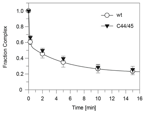 Figure 7. Kinetics of wt and C44/45 6S-1 RNA release from σA-RNAP (= complex decay) upon pRNA-induced 6S-1 RNA refolding. The setup was the same as in Figure 6A but conducted with only 50 µM of each NTP. The data was fit to an equation for a double exponential curve with offset. The rate constant k1 for the fast phase was calculated as 8.4 ± 0.02 min−1 (wt) and 7.2 ± 1.6 min−1 (C44/45) that for the slow phase (k2) as 0.19 min−1 (wt) and 0.17 ± 0.04 min−1 (C44/45); the release-resistant complex fraction (at the endpoint) was 0.21 (wt) and 0.22 (C44/45). For details, see Section 2.7.