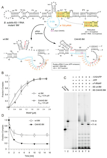 Figure 8. Characterization of wt 8M and C44/45 8M 6S-1 RNAs. (A) Secondary structure of the two 6S-1 RNA variants in the free state (top) and after the structural rearrangement (bottom) induced by pRNA transcription. The eight mutations (8M) are highlighted in red, the C44/45 mutations in magenta. In the sketches of the rearranged structures (bottom), the favored structures based on RNAfold dot plot analysis are shown. The first A residue in the pRNA sequence is marked by a circle. The ΔG of the 6S-1 8M RNA:pRNA 11-mer hybrid helix is predicted as −20.7 kcal/mol (RNAfold), compared with −22.4 for a pRNA 14-mer annealed to wt 6S-1 RNA (Figure 1B). (B) σA-RNAP binding affinity of the two 6S-1 RNA variants. K1/2 gives the σA-RNAP concentration at half-maximal saturation. The curves are approximating curves (B-spline of order 3; data point errors, SEM). (C) pRNA transcription by SG7 σA-RNAP (0.45 µM) using either wt 8M or C44/45 8M RNA (1.06 µM) as template, and in the presence of all four NTPs (each 200 µM) or with CTP, GTP, and UTP (each 200 µM) but lacking ATP, as indicated above lanes 5–8. Lanes 1 and 2, pRNA 8- and 14-mer markers; lanes 3 and 4, controls lacking either 6S RNA (lane 3) or enzyme (lane 4). These experiments were conducted with SG7 σA-RNAP. (D) Kinetics of pRNA-induced complex decay for wt 8M or C44/45 8M RNAs using SG7 σA-RNAP (2 µM) and 100 µM each CTP, GTP and UTP (see Section 2.7 for details); under these conditions, mainly pRNA 11-mers were synthesized based on the results shown in panel C. Data evaluation was performed as described in the legend to Figure 7 and in Section 2.7. The rate constants k1 for the fast phase could not be stably predicted, those for the slow phase (k2) were 0.78 ± 0.12 min−1 (wt 8M) and 0.72 ± 0.08 min−1 (C44/45 8M), the release-resistant complex fractions were 0.48 (wt 8M) and 0.18 (C44/45 8M).