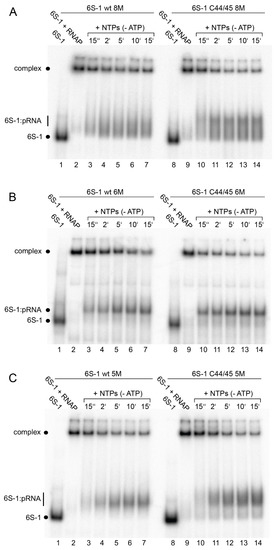 Figure 9. pRNA-induced rearrangement of 6S-1 RNA variants (A) wt and C44/45 8M, (B) wt and C44/45 6M, and (C) wt and C44/45 5M, using 5′-32P-end-labeled 6S-1 RNA, 2 µM SG7 σA-RNAP, and 100 µM each CTP, GTP, UTP, analyzed by 7.5% native PAGE. For details, see Section 2.7.