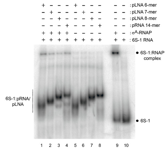 Figure 12. Effect of pLNA/pRNA length on 6S-1 RNA structure analyzed by 10% native PAGE. Annealing of pLNA 6-, 7- or 8-mers, or a pRNA 14-mer, to 5′-32P-labeled 6S-1 RNA either without (lanes 5–8) or with native σA-RNAP (lanes 1–4); σA-RNAP was added after pLNA/pRNA annealing to 6S-1 RNA, followed by incubation for 30 min at 37 °C before gel loading. For more details, see Section 2.10.