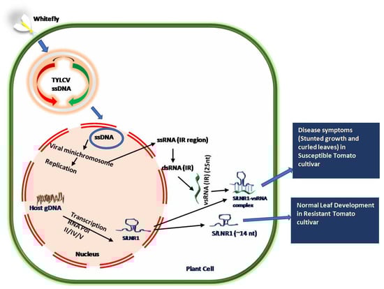 Generally, pathogen recognition activates a cascade of signaling pathways governing defense response. However, recently, the roles of lncRNAs involved in defense responses have been emerging. An expression analysis of lncRNAs indicated that several lncRNAs such as lincRNA and lncNATs were differentially regulated in response to the tomato yellow leaf curl virus (TYLCV) infection in TYLCV-resistant cultivar CLN2777 [,]. TYLCV belongs to the DNA Geminivirus containing a single-stranded circular DNA molecule in its genome. The lincRNAs such as slylnc0048, slylnc0049, slylnc0483, slylnc0531, and slyinc0934 were found to be upregulated and slylnc0475, slylnc0476, slylnc0673, and slylnc1052 were downregulated in an expression analysis, suggesting their role in defense response against viral infection. Later, the lncRNA SlLNR1 from tomato (Solanum lycopersicum L.) was reported to be involved in plant growth and leaf development. A viral small interfering RNA (vsRNA) derived from the intergenic region (IR) of TYLCV is almost perfectly complementary with long non-coding RNA, SlLNR1. The non-coding IR sequence of intergenic regions consists of 25 nucleotides, which are required for replication and transcription within the host cells. The vsRNA induces silencing of SlLNR1 in TYLCV-susceptible tomato cultivar by RNAi and its downregulation causes stunted plant growth and curled leaf phenotypes [,]. A deletion in the 25 nt IR sequences has provided resistance to vsRNA-directed repression, as in the case of TYLCV-resistant cultivar CLN2777 (Figure 3). This is a good example of post-transcriptional gene silencing in which SlLNR1 is targeted by IR derived siRNA.