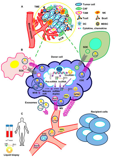 Crosstalk of circulating non-coding RNAs and tumor microenvironment. (A) The tumor microenvironment (TME) includes a cellular and an extracellular component. The cellular component consists of tumor cells, immune cells (TAMs, T cells, B cells, NK cells, DCs, and MDSCs) and cancer-associated fibroblasts (CAFs). The extracellular component of TME is composed by ECM proteins and signaling molecules (like cytokines, chemokines, growth factors, hormones, etc.), which are secreted by the cellular component. (B) ncRNAs are processed and released in body fluids. Circulating ncRNAs can be released in two ways: (1) as cell-free RNAs, complexed with protein such as AGO, NPM1 or HDL; or (2) in extracellular vesicles (exosomes and microvesicles). Both tumor cells and stromal cells may release exosomes in the TME. Through body fluids, ncRNAs can reach distant sites in the body and act as molecular mediators. (C) Circulating ncRNAs are stable and easily detectable and can be used as non-invasive biomarkers in liquid biopsy. TME: tumor microenvironment, TAM: Tumor-associated macrophage, NK: Natural killer cell, DC: Dendritic cell, MDSC: Myeloid-derived suppressor cell, CAF: cancer-associated fibroblast, ECM: extracellular matrix, SDE: Stromal-derived exosome, CDE: Cancer-derived exosome, AGO: Argonaute2, NPM1: Nucleophosmin 1, HDL: High-density lipoprotein, MVB: Multivesicular body, MV: Microvesicle, CTC: Circulating tumor cell.