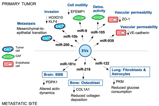 The endothelial function is strongly affected by the EVs of breast cancer cell derivation also at metastatic sites. Breast cancer cells metastasizing to the brain may indeed promote the destruction of the blood–brain barrier (BBB) through the secretion of EV-associated miR-181c, which in turn down-regulates 3-phosphoinositide-dependent protein kinase-1 (PDPK1). PDPK1 reduction then leads to activated cofilin-induced modulation of actin dynamics responsible for the BBB modification facilitating the metastatic process [40].