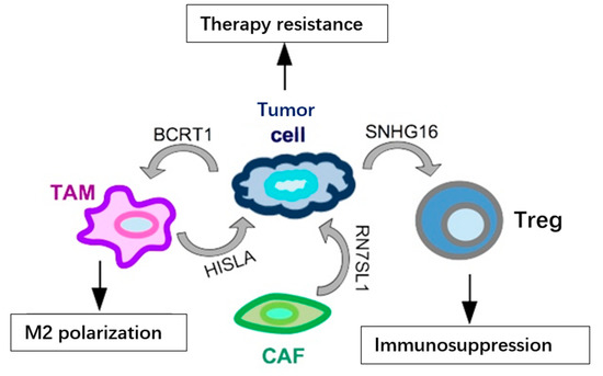 Examples of lncRNAs secreted in exosomes by cells in the TME and their functional output in TNBC. LncRNAs (BCRT1 and SNHG16) may be secreted by cancer cells and impinge on the activity of other cell types in the TME, such as TAMs and Tregs, enhancing their pro-tumoral behavior. At the same time, various cells in the TME may release lncRNAs, such as HISLA and RN7SL1, in exosomes and reach tumor cells to increase their resistance to treatments.