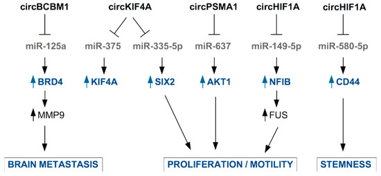 Interestingly, circBCBM1 (hsa_circ_0001944) overexpression in primary BC tissues was associated with shorter brain metastasis-free survival and with brain metastasis promotion in mouse model [113,114]. Accordingly, circBCBM1 was also found upregulated in plasma of BC patients who developed brain metastasis, becoming a putative novel diagnostic and prognostic biomarker and potential therapeutic target for breast cancer brain metastasis [114]. Functionally, circBCBM1 acts by sequestering miR-125a, enabling released expression of BRD4 protein with subsequent up-regulation of MMP9, a crucial player in the metastatic process.
