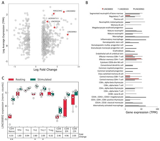 In order to select for T cell-specific transcripts, we interrogated several public repositories for the expression of some of the most significantly regulated lncRNAs. Analysis of data from the Blueprint consortium in the Expression Atlas at the EBI-EMBL website shows that LINC00892 had an expression pattern uniquely limited to CD4+ and CD8+ memory T cells (Figure 1B). T-regulatory cells also expressed LINC00892, although at lower levels compared to memory CD4+ T cells. On the contrary, both LINC00963 and LINC00324 had broader patterns of expression in the hematopoietic lineage (Figure 1B). MIR223HG, the host gene of hsa-mir223, although strongly induced in both Jurkat cells and FLs, was shown to be more specific for the myeloid lineage [30]. Restricted T cell expression of LINC00892 was evident also in the data from Monaco et al. [31], showing strong expression in most of the differentiated CD4+ T cell lineages (Figure S2A).