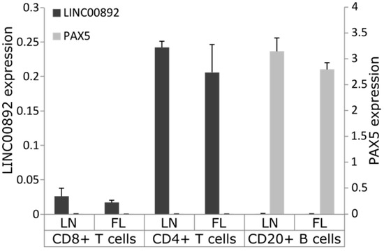 Expression analysis of LINC00892 and PAX5 in sorted cells. The analysis of gene expression of LINC00892 and PAX5 (as a B-cell marker) was performed using RT-qPCR from RNA extracted from CD4+ T cells, CD8+ T cells and CD20+ B cells sorted from a lymph node (LN) hyperplasia sample and an FL sample. The experiment has been performed in triplicate. GUSB was used as reference gene.