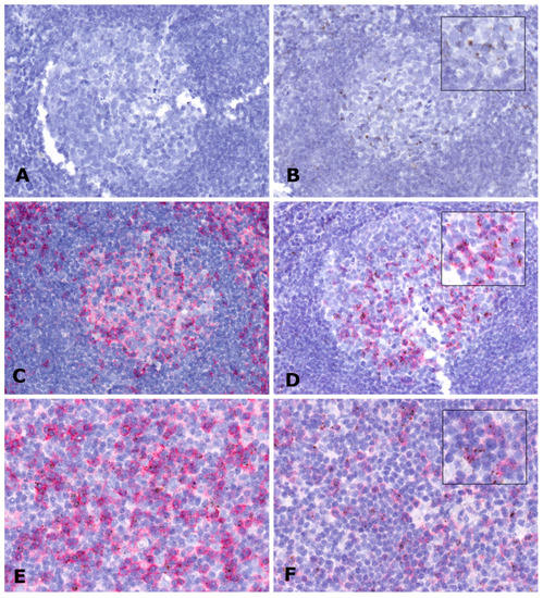 Intra-tissue LINC00892 localization using in situ hybridization (ISH) and immuno-histochemistry (IHC). RNA expression was analyzed by ISH using the RNAscope technology on FFPE slides from an LN (A–D) and an FL sample (E,F). Protein expression was investigated by IHC on FFPE slides from an LN (C,D) and an FL sample (E,F). LINC00892 expression is shown in brown. Expression of the proteins CD4 and PD1 is shown in red. (A) LN tissue stained by ISH with a negative control probe. (B) LN tissue stained by ISH with a LINC00892 probe. (C) LN tissue stained by ISH with a LINC00892 probe and by IHC with an anti-CD4 antibody. (D) LN tissue stained by ISH with a LINC00892 probe and by IHC with an anti-PD1 antibody. (E) FL tissue stained by ISH with a LINC00892 probe and by IHC with an anti-CD4 antibody. (F) FL tissue stained by ISH with a LINC00892 probe and by IHC with an anti-PD1 antibody.