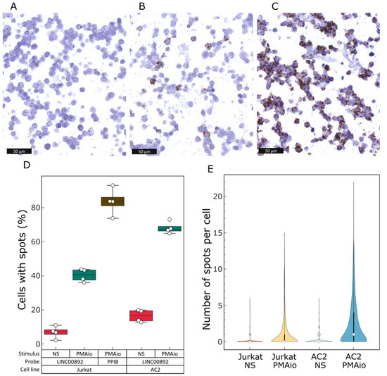 Relative to RT-qPCR, ISH has the advantage of enabling expression analysis in single cells. We therefore also performed ISH with the LINC00892-specific probe in Jurkat cells treated or not with PMA/ionomycin for 48 h. Visual inspection of the results showed that in both treated and untreated samples, not all of the cells were positive for LINC00892 expression (Figure 5A,B). ISH analysis using RNAscope reagents produces signal spots that are derived from the amplification of single RNA molecules. In order to quantify LINC00892 expression in treated and untreated Jurkat cells, we performed computer-assisted image analysis. Image fields were analyzed to count the number of cells having no spots, those having few spots and those having many spots. Interestingly, in untreated samples, almost 90% of the cells had no spots specific for LINC00892 (Figure 5D,E). This was not due to a technical artifact, as a probe recognizing Cyclophilin B (PPIB) stainined more than 80% of the cells (Figure 5C,D). In PMA/ionomycin-treated samples, the number of LINC00892-negative cells was still above 60%. In order to understand if the strong difference in LINC00892 expression observed in the Jurkat cell population was due to cellular heterogeneity of the Jurkat cell line used, we sub-cloned the cell line and repeated the analysis in a single-cell clone (Clone AC2). Interestingly, although Clone AC2 showed a mild increase in cells with spots, it was still characterized by strong cellular heterogeneity, with more than 80% of the cells expressing no LINC00892 in untreated conditions (Figure 5D). Contrary to the parental cell line, treatment with PMA/ionomycin increased the number of cells positive for LINC00892 to 70%. The same kind of picture is evident if we analyze the number of spots per cell in all conditions as a measure of intensity of LINC00892 expression (Figure 5E). This observation suggests that Jurkat cells might be heterogeneous in their ability to respond to PMA/ionomycin in the activation of LINC00892 expression. Interestingly, a similar heterogeneous expression pattern has been observed previously by ISH in the analysis of cytokine expression in cloned Th1, Th2 and Th0 cell lines [37].