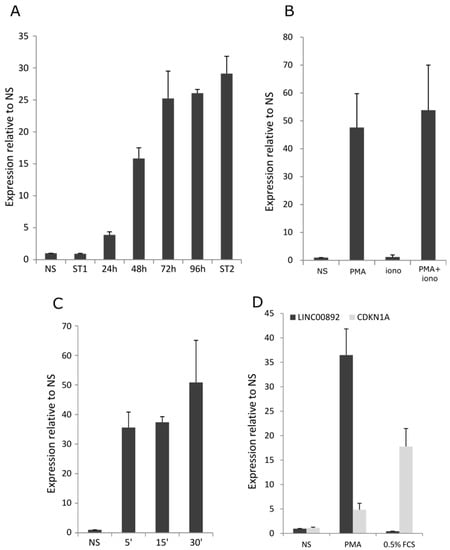 As shown in Figure 2A, LINC00892 is strongly induced in Jurkat cells following treatment with a combination of PMA and ionomycin. The reason for the concomitant use of PMA and ionomycin to induce T cell activation is based on the need to activate multiple signal transduction pathways. PMA is a potent activator of the PKC pathway, while ionomycin, by increasing intracellular calcium levels, induces the activation of NFAT. Genes like IL2 typically require both drugs for full transcriptional activation, but for the activation of other genes, the presence of either PMA or ionomycin might be sufficient [38]. In order to characterize the details of LINC00892 expression following Jurkat cell activation, we performed several analyses. First, we analyzed the kinetics of LINC00892 expression following PMA/ionomycin treatment; second, we investigated whether transcriptional induction required the concomitant presence of PMA and ionomycin; third, we determined to what extent the intensity and duration of the stimulus influenced LINC00892 expression. As shown in Figure 6A, we found that, contrary to IL2 (Figure S5A), LINC00892 expression was late and persistent: following PMA and ionomycin treatment, its expression barely changed after 3 h, started to increase after 24 h and reached its maximum after 72 h. A second stimulation 4 days after stimulus withdrawal still increased LINC00892 expression but without reaching statistical significance. The expression behavior of LINC00892 in Jurkat cells is therefore strikingly similar to that observed in naïve and memory primary T cells (Figure 1C). We also found that most of the increase in LINC00892 expression after stimulation was due to the action of PMA only. The use of ionomycin alone did not vary LINC00892 expression, and the concomitant use of PMA and ionomycin resulted in a further but not significant increase relative to PMA alone (Figure 6B). Next, we tested several concentrations and stimuli durations and found that PMA at 1 ng/mL given for 5 min was already able to induce a strong increase in LINC00892 expression (Figure 6C). As shown in Figure S1, PMA and ionomycin treatment was accompanied by cell growth arrest with a strong induction of CDKN1A, the gene coding for the cell cycle inhibitor p21. As for LINC00892, CDKN1A induction was also dependent on PMA only (Figure S5B). Interestingly, PMA has already been shown to induce p21 expression and cell cycle arrest in other cell systems [39]. Given that LINC00892 expression in our experimental conditions was associated with p21 induction and growth arrest, we asked if other stimuli that induce cell cycle arrest and p21 induction would result in an increase in LINC00892 expression. As shown in Figure 6D, serum starvation of Jurkat cells for 48 h, although associated with a strong induction of CDKN1A, was not accompanied by an increase in LINC00892 expression.