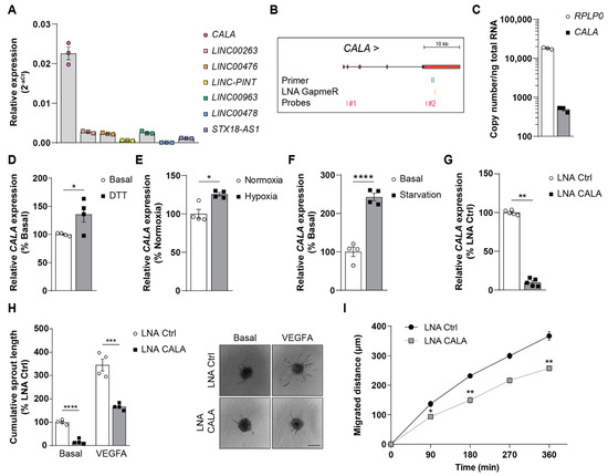 Located at the interface between the blood and the surrounding tissue, endothelial cells are paramount in sensing, and quickly adapting to environmental changes, thus guaranteeing cellular homeostasis and function [21]. The contribution of lncRNAs to these processes is not well-understood. Searching for stimuli-responsive lncRNAs in published datasets, 7 transcripts caught our interest, which were found to be rapidly activated in response to different external stimuli in numerous cell types [22]. Analyzing the expression levels of these lncRNAs in human umbilical vein endothelial cells (HUVECs), the lncRNA CALA was found to be the highest expressed (Figure 1A,B). Absolute quantification of CALA levels in HUVECs under basal conditions confirmed a robust expression of ~490 copies/ng total RNA (Figure 1C), identifying CALA as a highly expressed, yet uncharacterized, lncRNA. To analyze the role and function of CALA in the endothelium, we first assayed expression changes of CALA upon different stimuli. Interestingly, ER stress, hypoxia, and starvation stimuli impacting endothelial cell functions [23,24,25] significantly drove CALA expression in HUVECs (Figure 1D–F and Figure S1A).
