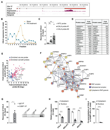 For the second identified protein network of cytoplasmic RNP granule proteins, factors involved in mRNA metabolism, were prevalent. Specifically, CALA affinity selection co-enriched the multi-functional homologs G3BP1 and G3BP2 (Figure 2D,F). Besides forming homo- and hetero-multimers [31,32], both proteins engage in RNA/DNA binding and numerous protein interactions [33,34]. In line with this, we also enriched numerous G3BP-binding proteins (Figure 2D,F): E.g., CAPRIN1 (Cytoplasmic activation/proliferation-associated protein-1), PABPC1 (Polyadenylate-binding protein 1), NUFIP2 (Nuclear fragile X mental retardation-interacting protein 2), ATXN2L (Ataxin-2-like protein), and UPF1 [34] (Figure 2D,F). Subsequently, we validated the interaction between CALA and G3BP1, the key component of CALA’s identified cytoplasmic RNP granule protein network, by RIP from total cell lysate which revealed a substantial fraction of CALA (~20%) to be bound by G3BP1 (Figure 2G). Since the interactome of CALA clearly separates into nuclear and cytoplasmic protein fractions, we next analyzed the subcellular distribution of CALA and accordingly found CALA present in both compartments, compared to specific marker transcripts (Figure 2H). Subsequently, we specifically addressed the site of interaction between CALA and G3BP1 by anti-G3BP1 RIPs in cytoplasmic and nuclear fractions and demonstrated an almost exclusive cytoplasmic interaction between both binding partners (Figure 2I).