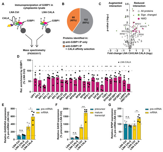 To analyze the function of CALA within the identified G3BP1-positive RNPs, we first performed anti-G3BP1 RIPs in cytoplasmic lysates, followed by mass spectrometry (PXD033517, Figure 3A, left). Strikingly, this analysis revealed an overlap of 68 proteins (40%) that were also recovered by CALA antisense affinity selections (Figure 3B, Table S1), highlighting a shared protein interactome. Among the proteins, we identified the G3BP1 binding partners G3BP2, CAPRIN1, PABPC1, NUFIP2, ATXN2L, and UPF1 [34], strongly supporting the notion that CALA is also part of this complex. We next repeated the anti-G3BP1 RIPs in CALA-silenced HUVECs and determined changes in the G3BP1 interactome by mass spectrometry (PXD033517, Figure 3A, right). After excluding an effect of CALA silencing on G3BP1 expression (Figure S3A,B), we observed 36 of the G3BP1-interacting proteins to be differentially associated with G3BP1 upon CALA silencing. While only 3 proteins showed an augmented G3BP1 interaction, the remaining 33 proteins were significantly decreased in their G3BP1 interaction (Figure 3C). Gene ontology analysis assigned the majority of these proteins to NMD [35] (Figure 3C,D and Figure S3C). Among the NMD proteins, we found reduced interactions between G3BP1 and UPF1 (Figure 3C,D). UPF1 is a key regulatory factor of NMD and other mRNA decay pathways, thereby broadly affecting mRNA fate (extensively reviewed in [8]). Furthermore, interactions of the RNA helicase MOV10 with G3BP1 were reduced (Figure 3C,D). MOV10 has been reported to be involved in mRNA decay [36], and was shown to be especially important for proper UPF1-mediated mRNA decay, as the translocation of MOV10 on target mRNAs ensures removal of secondary structures and proteins, enabling decay [37]. Additionally, CALA silencing disrupted the interaction between G3BP1 and ribosomal proteins like RPS6, RPS8, RPS11, and RPL23A (Figure 3C,D). Interestingly, G3BP1 has been previously shown to interact with 40S subunits [38] and with respect to mRNA decay, UPF1 was reported to interact with 40S subunits upon ribosome stalling and the initiation of NMD [39]. Together, these findings support the notion that CALA is involved in NMD.