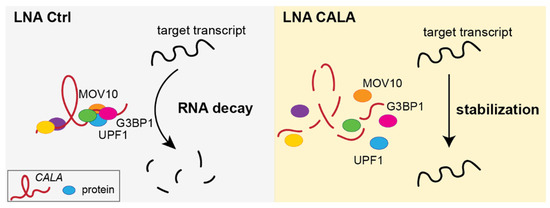 In summary, our data indicated that CALA is required for the stabilization of cytoplasmic G3BP1-positive RNPs implicated in mRNA decay (Figure 4). We showed that the loss of CALA led to the disintegration of G3BP1-RNPs and, ultimately, to the stabilization of target transcripts, as evidenced by an increase in RNA expression levels (Figure 4). Overall, these results describe CALA as a regulator of RNA decay in the cytoplasm.