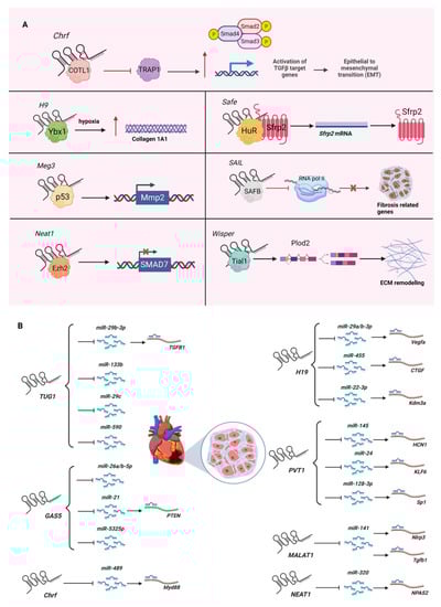 Role of lncRNAs in cardiac fibrosis: (A) Mechanisms of action of lncRNAs in the pathogenesis of cardiac fibrosis. (B) LncRNAs as miRNA sponges for cardiac fibromiRs. Please see Table 1 for mechanistic descriptions. Figure created with BioRender.com, accessed on 22 June 2022.