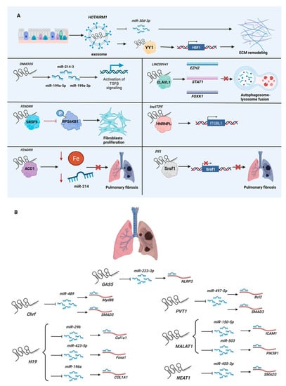 Role of lncRNAs in pulmonary fibrosis: (A) Mechanisms of action of lncRNAs in the pathogenesis of pulmonary fibrosis. (B) LncRNAs as miRNA sponges for pulmonary fibromiRs. Please see Table 2 for mechanistic descriptions. Figure created with BioRender.com, accessed on 22 June 2022.