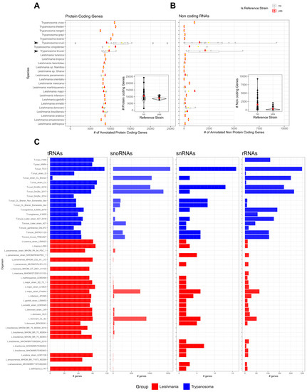 Outlook of the non-coding genomic annotations available in TriTrypDB. All Leishmania spp. and Trypanosoma spp. genomic data was obtained from TritrypDB (Release 56) for protein-coding genes (A) and non-protein-coding genes (B). The inset plot presents the distribution of the number of genes annotated for all genomes grouped by reference and non-reference strains. For the main ncRNAs biotypes (tRNAs, snoRNAs, snRNAs, and rRNAs) the number of features annotated is presented in bar plots (C) for all genomes with a least 1 ncRNA annotation. Arrows point out species with large numbers of genome strains sequenced.