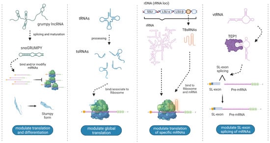 Regulatory non-canonical ncRNAs with experimentally demonstrated roles reported in trypanosomatids. The illustrations represent the structure, processing and proposed mechanisms of action of the four ncRNAs reported so far [28,30,37,57]. Created with BioRender.com (accessed on 13 May 2022).