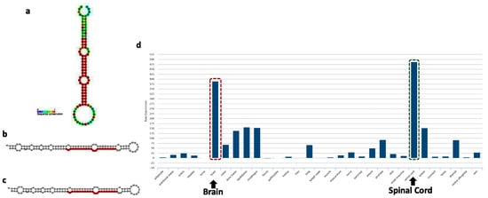 MiR-218 characteristics. Stem-loop structure of precursor miR-218 (a). The color scale shows the sequence conservation pattern within the stem-loop structure of the precursor miR-218. The independent stem-loop structure of miR-218-1 (b) and miR-218-2 (c). The expression atlas of mature miR-218-5p in different human tissue types. The highlighted bar shows the highest expression level observed in brain tissue besides the spinal cord (d).