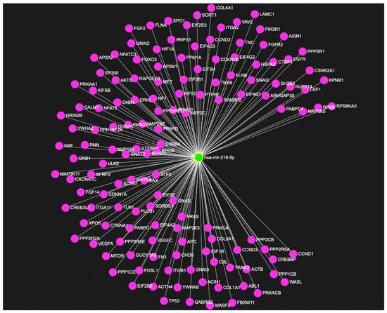 MiR-218-5p as a center of a diverse target gene-regulatory network enriched in the brain. The figure shows the regulation of various genes targeted by miR-218-5p.