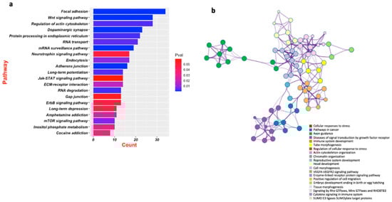 Brain-centric functional pathways based on an algorithmic determination of miR-218-5p target genes. Key pathways (bar plot) affected the central nervous system based on the brain-enriched predicted targets of miR-218-5p (a). The target pathways based on the predicted target of miR-218-5p are used to create a network map. The significantly enriched pathways from the network map, which are enriched in brain functions, are shown with color legends (b).