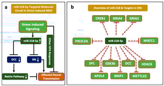 miR-218-5p targeted molecular circuit in stress-induced neuropsychiatric conditions. Stress-induced upregulation of miR-218 causes deficiency in Netrin and Robo signaling pathways via DCC and SLIT genes (a). The enriched targets of miR-218 in the central nervous system (b).
