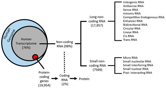 Figure 1. Schematic classification of the human transcriptome: 76% of protein-coding genes from the human genome (blue circle) are transcribed into RNA (gray circle), whereas only 2% (red circle) are translated into functional proteins. The remaining 98% are known as non-coding RNA. Two sub-classes emerge from non-coding RNA: small non-coding RNA (sncRNA) and long non-coding RNAs (lncRNAs).