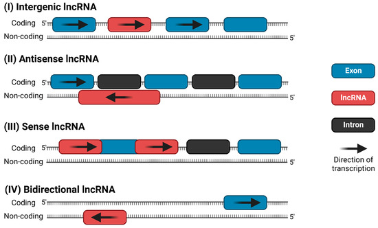 Figure 2. The four most common categories of lncRNAs: (I) long intergenic ncRNA (lincRNA), (II) antisense lncRNA, (III) sense intronic ncRNA, and (IV) bidirectional lncRNA.