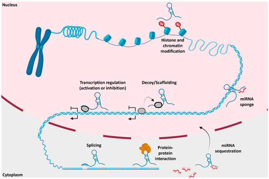 Figure 3. Molecular and pathological mechanisms of lncRNAs in and outside the nucleus: Various functions of lncRNAs occur, such as histone modification, transcriptional regulation, scaffolding, microRNA sequestration, splicing, and protein–protein interaction. Adapted from Hu et al. 2018 and Yang et al. 2021. Created using BioRender.