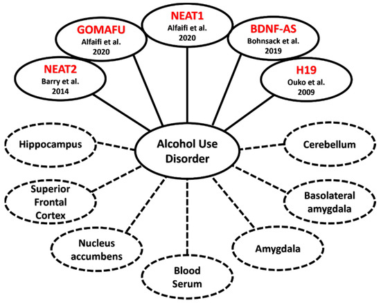 Figure 4. Linkages between lncRNA and AUD: lncRNAs contributing to the emergence of Alcohol Use Disorder (solid lines) and the diverse areas of the human body that samples were taken from (dotted lines), such as regions of the brain or blood serum [36,39,47,53,74,75,76,77].