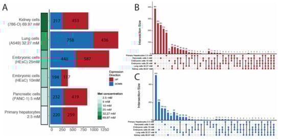 (A) Differential lncRNA isoforms counted per series using a cutoff of p-value < 0.05 and absolute log2foldchange > 0.5. Series are ordered according to descending metformin concentration. Number of upregulated lncRNA isoforms shown in dark red and number of downregulated lncRNA isoforms shown in dark blue. Upset plots of up- (B) and downregulated (C) lncRNA isoforms which intersect between series.