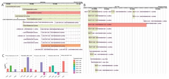 MALAT1 and NEAT1 were the lncRNAs with the highest number of neighbor DE transcripts following metformin treatment: 458 and 437, respectively (Figure 4A). Both these lncRNAs are located in a very populated region on chromosome 11. Conversely, LINC00909 and ZBED5-AS1 were the lncRNAs with the lowest number of DE transcripts in their vicinity, with fewer than 100 transcripts around their genomic position (Figure 4A).